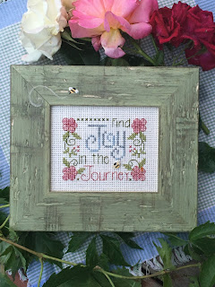 We love Cecilia's Tiny Towns. This one is stitched on a 30 count pink linen and the buttons are included in the chart. It is framed in a marvelous frame from Jill, our friend and framer